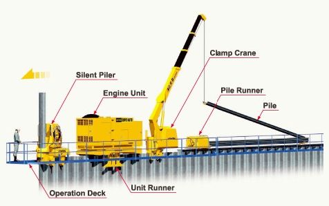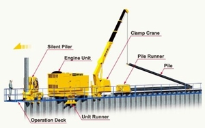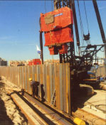| Drukken Stalen damwandplanken worden ook ingedrukt in de grond, waarbij zeer weinig trillingen worden geproduceerd. Het indrukken en trekken vindt plaats door middel van hydraulische cilinders, waarbij de reactiekracht wordt ontleend aan reeds in de grond aanwezige planken of aan een ballastframe, waaraan de machine zich vastklemt. Het grote voordeel van deze werkwijze is het vrijwel trillingsvrije karakter. Het nadeel ligt in de geringe productiesnelheid, vergeleken met de andere technieken.