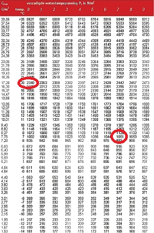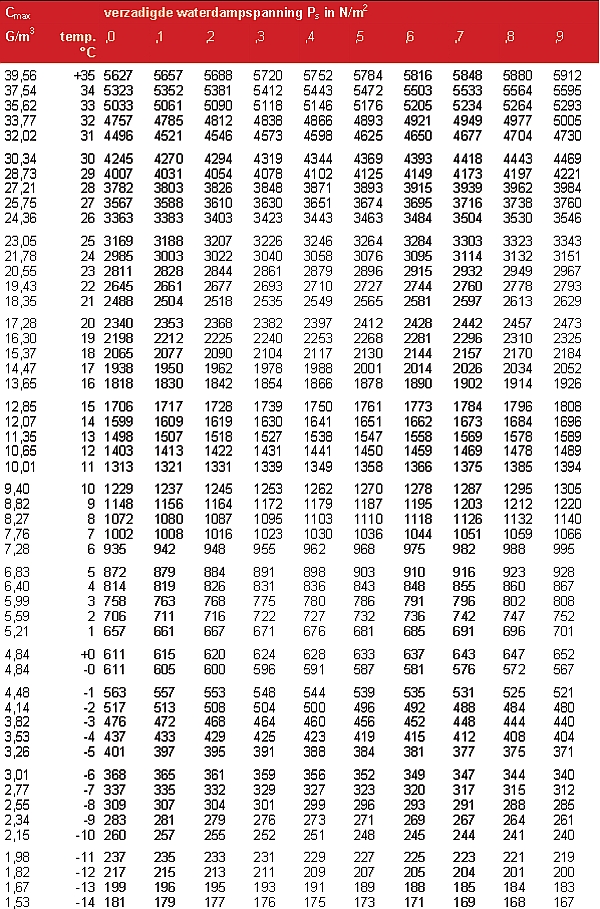 dampspanningstabel met maximale waterconcentratie (cmax) in g/m3 en verzadigde dampspanning (ps) bij een bepaalde temperatuur (in graden celsius, met 1 cijfer achter de komma); klik voor groter!:![]() |
