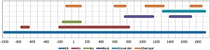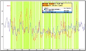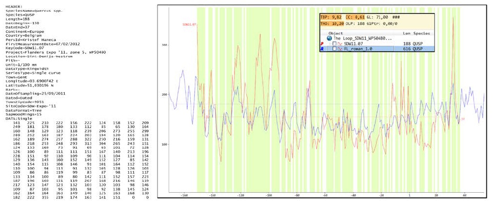 een grafiek die met metingen is opgebouwd; rood is meetreeks, blauw is referentiekalender, groene zone geeft gelijkloop aan; klik voor groter! (uit pdf dendrochronologie en erfgoedonderzoek van onroerend erfgoed vlaanderen): ![]() |