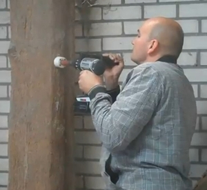 Met een holle boor wordt in de houten constructie geboord. In het staafje dat hier uit komt, zijn de jaarringen van het hout zichtbaar.
