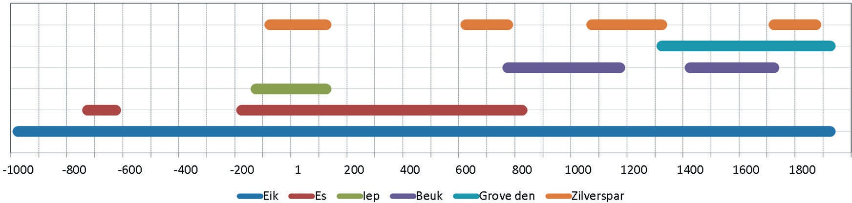 dateerbare houtsoorten, overzicht van kalenders van in Nederland aangetroffen dateerbare houtsoorten vanaf 1000 v. chr; klik voor groter! (afb. esther jansma, cultureel erfgoed): ![]() |