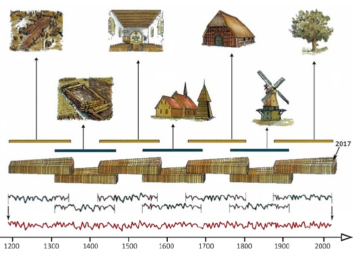jaarringkalender; verschillende stukken hout kunnen op basis van hun jaarringpatronen (de breedtes van de diverse jaarringen) gesynchroniseerd worden, waarna een voor die houtsoort en dat herkomstgebied een "algemene" jaarringkalender gemaakt kan worden; klik voor groter! (onroerend erfgoed vlaanderen): ![]() |