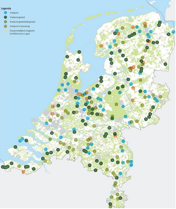 ontsnippering (tegengaan van versnippering van natuurgebieden, op de kaart wat ooit de knelpunten waren en eronder een voorbeeld hoe de versnippering tegen te gaan met een ecoduct, als er geen andere oplossing is) (mirt overzicht): ![]() |