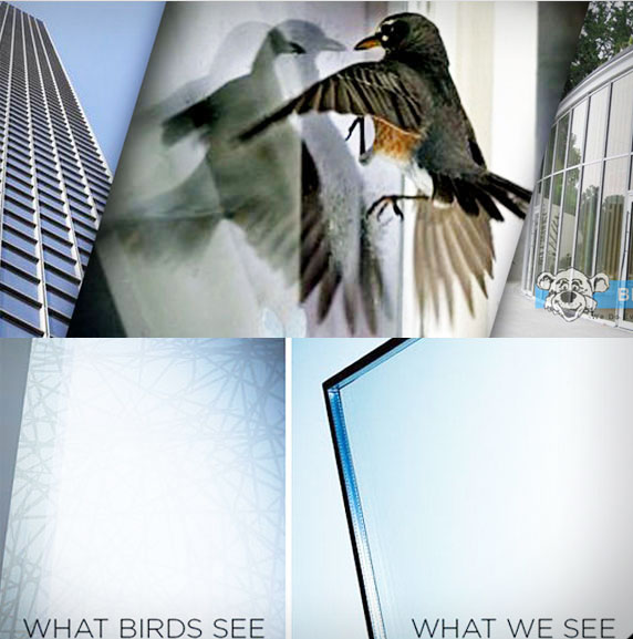 - vogelmarkering / raamstickers / ruitmarkering (vaak een roofvogel); vooral nodig bij grote glaspanelen, op de onderste vier verdiepingen; "bij doorzichtig glas de stickers bevestigen aan de binnenkant, bij donker of spiegelend glas aan de buitenkant"