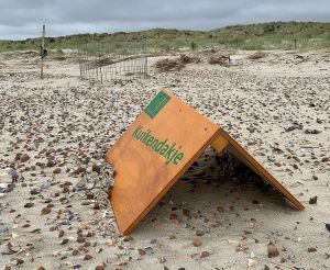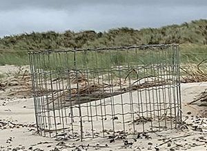 kuikendakje en vluchthek (vluchtomheining) ter bescherming van eieren en vogels op het strand of in een weiland (foto wendy janse, vogelbescherming.nl) ![]() |