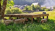 vrij laag houten plateau voor schapen in de wei, tegen zon, regen, hagel, sneeuw (foto toont een plateautje op een eilandje in de semoisvallei in belgië): ![]() |