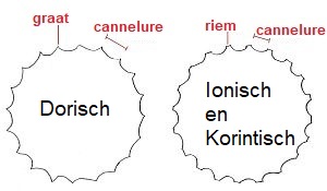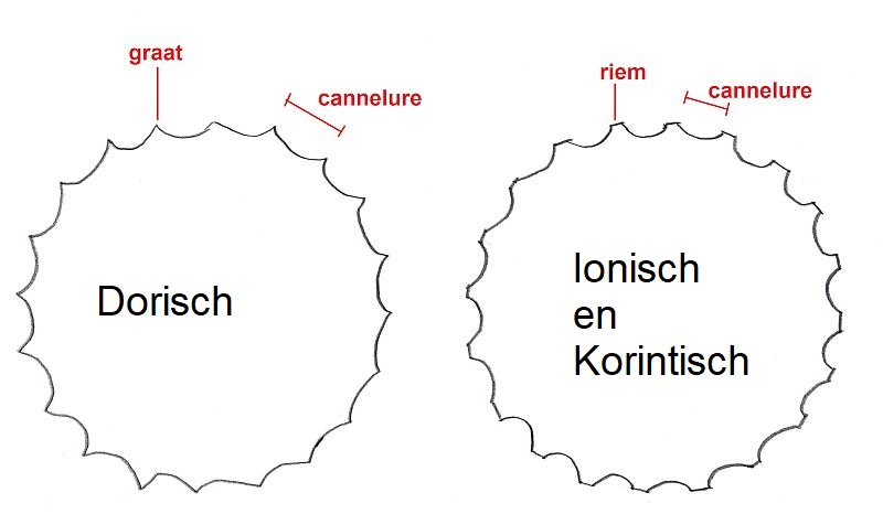 links doorsnede van een dorische zuil met cannelures, de cannelures raken elkaar met een graat, en rechts van een ionische of korintische zuil met cannelures, de cannelures raken elkaar met een riem: ![]() |