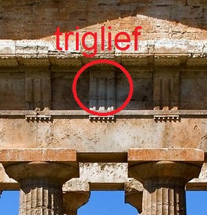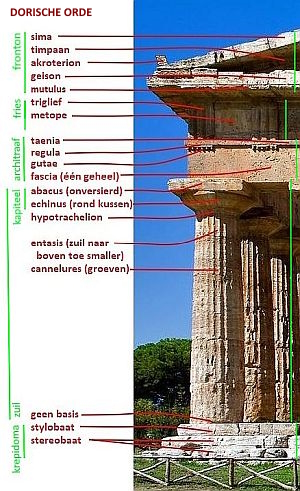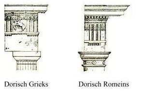 grieks dorisch en romeins dorisch, met geison, fries, architraaf, kapiteel: ![]() |