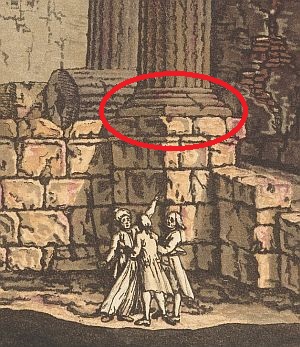 romeins dorisch; i.t.m. grieks dorisch wél een basement (basis); hier toevallig ook geen reguliere treden onder de basis; tempel van hercules in cori italië, johann gottlieb prestel, ca. 1784; klik voor de volledige afbeelding (national galery of art): ![]() |