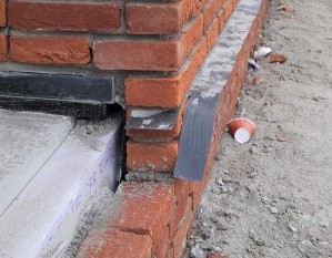 voorbeeld van dpc-folie dat net boven het maaiveld wordt aangebarcht (uit de pdf trasraam in baksteen metselwerk van knb-keramiek): ![]() |