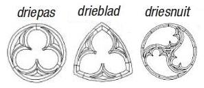 verschillende traceervormen (maaswerk) waaronder tweesnuit en driesnuit, driepas, drieblad en blaasbalg; klik voor groter: ![]() |