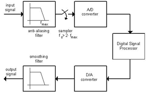 veranderen. Een digitaal signaal bestaat echter alleen op discrete tijdstippen en dan ook slechts een beperkt aantal amplitudeniveaus kent; een digitaal signaal is dus zowel in tijd als in amplitude discreet. Een analoog signaal zal eerst moeten worden gedigitaliseerd alvorens het digitaal kan worden bewerkt. Om dit te bereiken wordt het analoge ingangsignaal eerst in bandbreedte beperkt. Vervolgens wordt de amplitude van het bandbegrensde signaal periodiek gemeten. Dit proces heet bemonsteren of