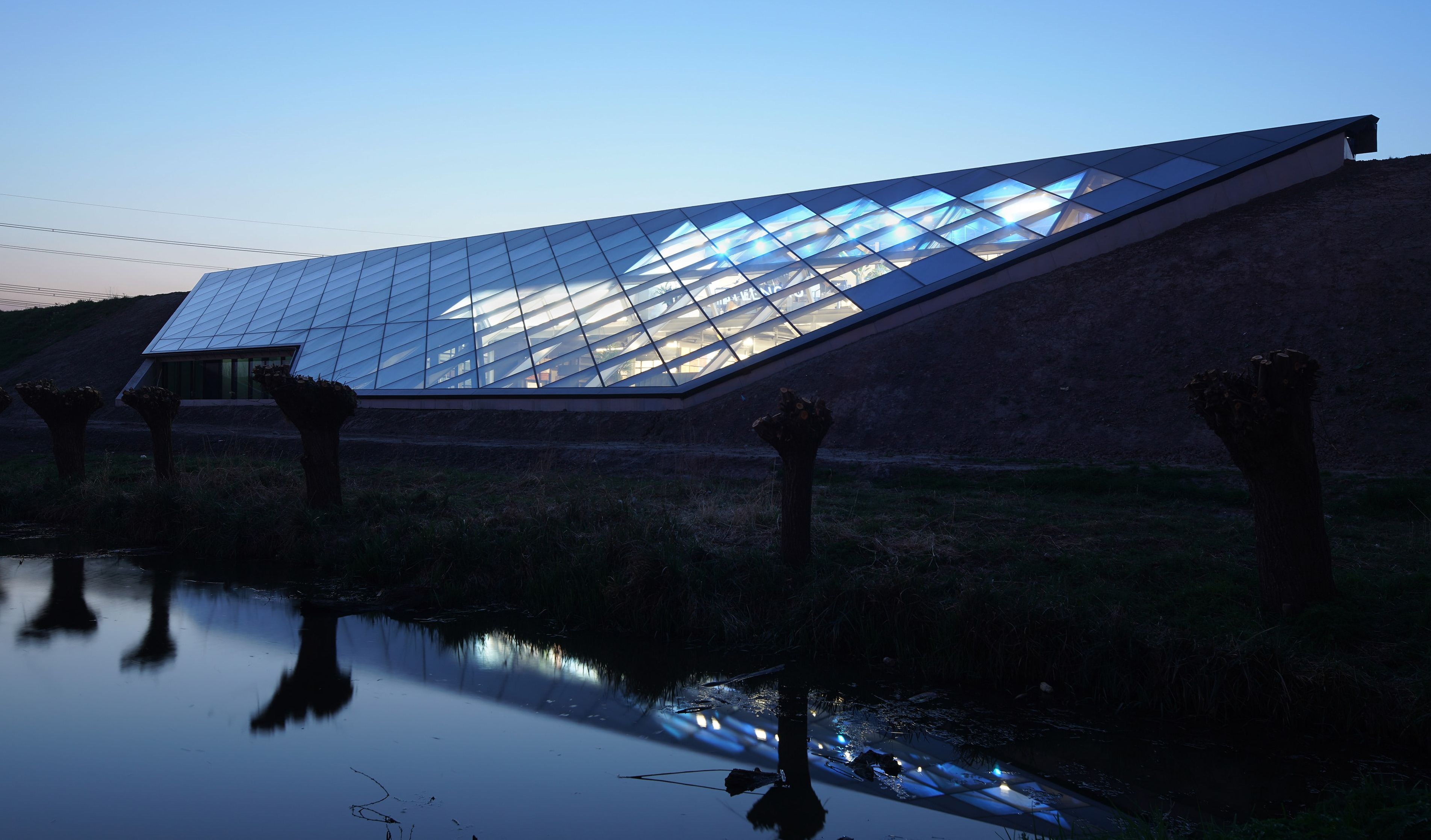 dubbel grondgebruik (dubbel ruimtegebruik) door bouwen in een geluidswal bij a20 rotterdam, waarbij een verdiepte strook in het dak (hier niet zichtbaar) allerlei pijpjes aan het zicht onttrekt en een fraai strak beeld geeft; klik voor groter (steen010, advisering van het gebruik van baksteen in gevels): ![]() |