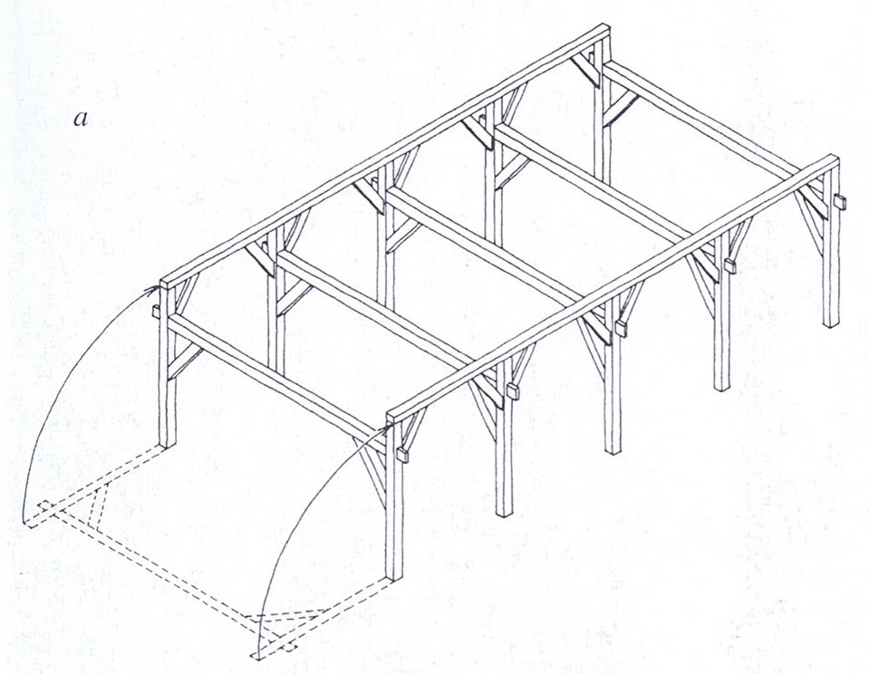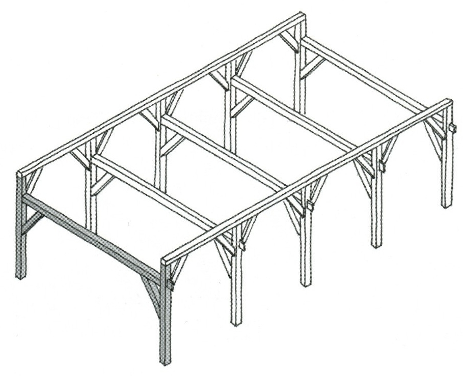 dwarsgebinten in een kapconstructie; (de eerste afbeelding is uit het boek inleiding in de bouwhistorie van ronald stenvert en gabri van tussenbroek, uitgeverij matrijs, afbeelding ronald glaudemans; de tweede afbeelding uit het boek houten kappen in nederland 1000-1940 van herman janse digitale bibliotheek van de nederlandse letteren dbnl); klik voor groter in de tekening is het eerste gebint donkergrijs, de overige gebinten zijn "wit": ![]() |