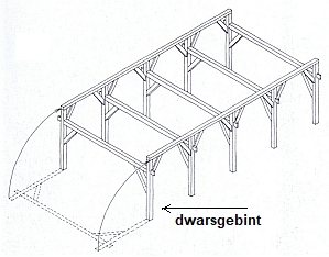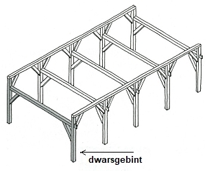 lengterichting van het gebouw. Een dwarsgebint bestaat uit twee stijlen, een verbindende balk (vrijwel) bovenaan de stijlen en meestal twee