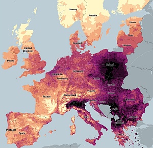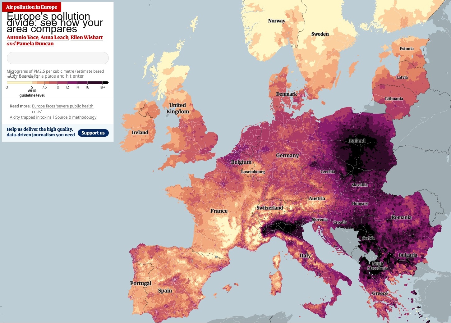 verdeling van fijnstof pm2,5/m3 in de europese unie; de situatie in nederland en andere west- en noord-europese landen valt op dit kaartje eigenlijk best wel mee...; klik voor groter! (the guardian, 20 sep 2023): ![]() |