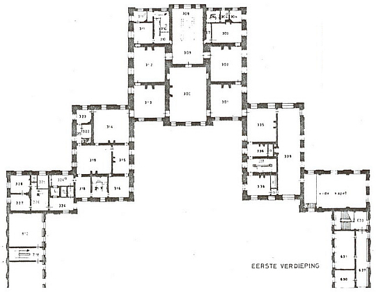 paleis het loo met een aantal kortere enfilades; de hoekkamers bovenin de afbeelding zijn meer privé omdat zij slechts één deuropening hebben; klik voor groter: ![]() |