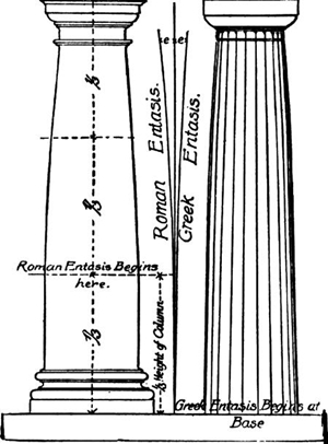 boven toe niet rechtlijnig is maar een zekere boog beschrijft. Vooral bij hogere gebouwen werd in de klassieke tijd