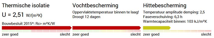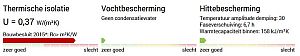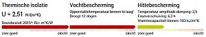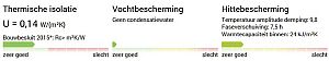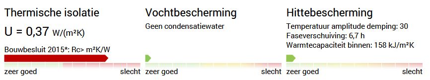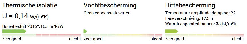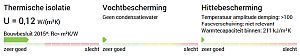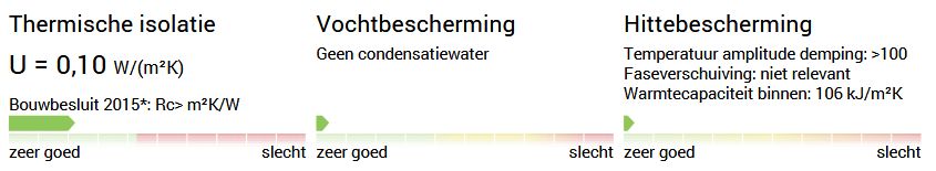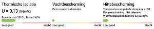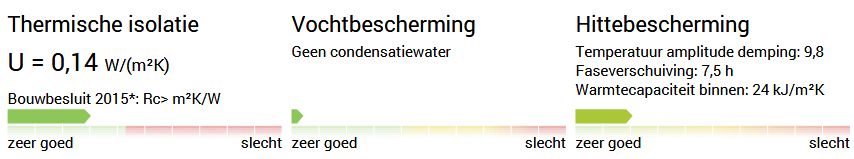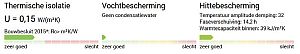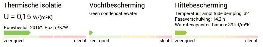 - Wat betreft de thermische isolatie aan de "buitenkant": de volumieke warmtecapaciteiten van EPS, XPS, PUR en PIR zijn ca. 40 kJ/m3K en van bijvoorbeeld cellulose ca. 100 kJ/m3K. Deze isolatiematerialen kunnen dus niet veel warmte opnemen, daardoor beter warmte van buiten afschermen en ook minder uitstralen in de nacht. Overigens, de warmtecapaciteit wordt door de U-wert-rechner gegeven in kJ/m2.K over de gehele dikte van de muur, en dus niet in kJ/m3K.