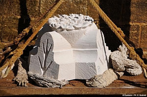 gewelfsleutel voor het gewelf van de foto boven en onder (bovenzijde van sluitsteen is na installatie de zichtbare onderzijde van de sluitsteen); klik voor groter (guédelon, foto c. guérard): ![]() |