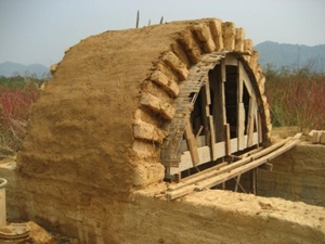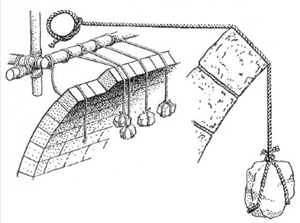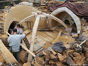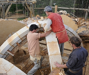 naast het formeel worden ook o.m. wiggen en andere houtjes toegepast om de stenen op de correcte plaats te zetten en te houden terwijl de specie droogt; klik voor groter (guédelon, foto c. guérard): ![]() |