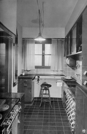 functionalisme, frankfurter kuche, een rationele keuken voor de sociale woningbouw, de eerste "aanbouwkeuken", ontwerp grete schutte-lihotsky, 1926: ![]() |