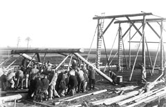 Het richten van een gebint was een heel spektakel, en na afloop vierden de mannen het met een stevige borrel.