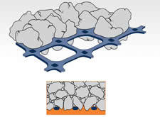 in verankerd wordt. Wanneer de granulaire deeltjes boven het geogrid worden verdicht, worden ze gedeeltelijk in en door de openingen van het geogrid geperst. Het gevolg is een sterke en effectieve insluiting.