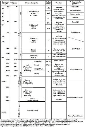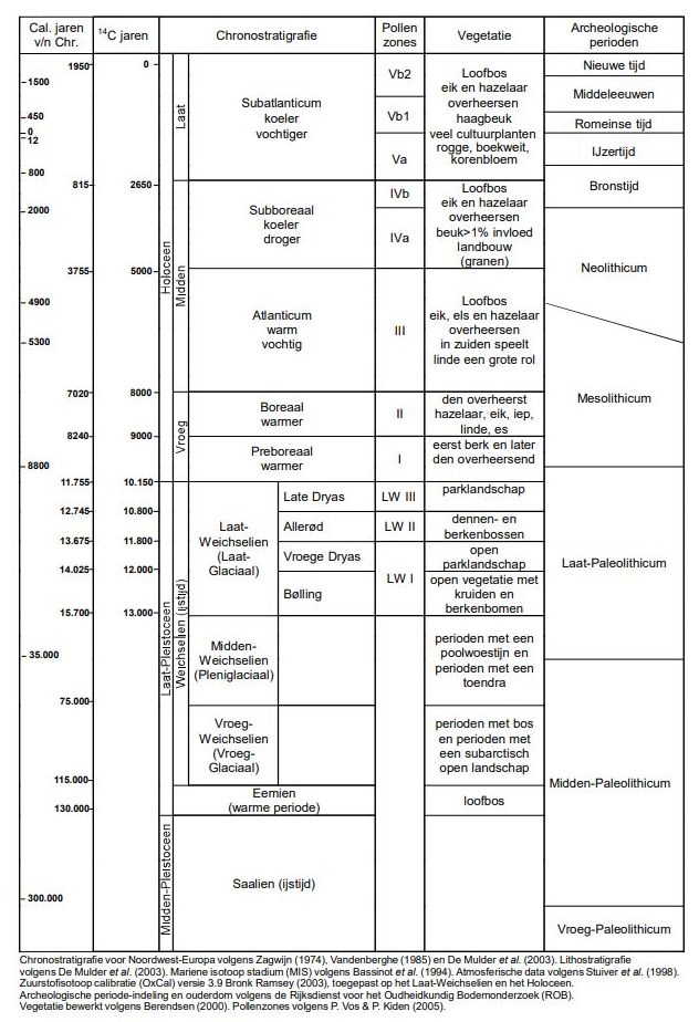 geologische en archeologische tijdvakken; jaren voor/na chr (ouderdom), 14c-jaren, chronostratigrafie, pollenzones, vegetatie, archeologische perioden; klik voor groter! (commissie mer): ![]() |