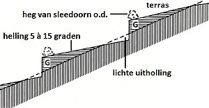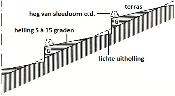terras met graft (G), heg en een uitholling aan de voet van de graft; meestal is een graft minder steil dan op de tekening (uit boek over hagelkruisen, banpalen en pestbosjes, uitg. matrijs, 1993, tekst toegevoegd)![]() |