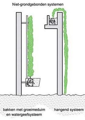 groengevel, niet-grondgebonden systemen (bakken met groeimedium en watergeefsysteem of volledig hangend systeem): ![]() |