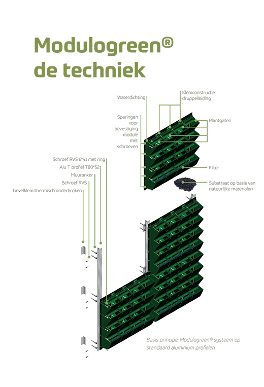 - de opbouw van de groene gevel, in het bijzonder van de dragers, moet ervoor zorgen dat de gebouwgevel zelf niet permanent vochtig is en dat er geen ongedierte in de gevel kan komen