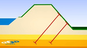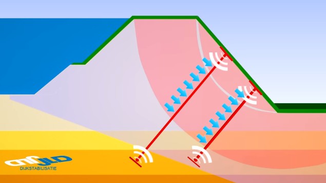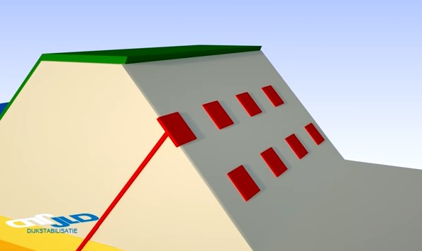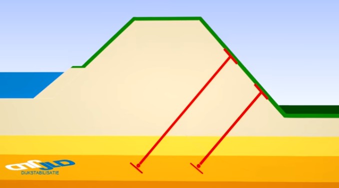 grondankers bij de dijk van de amsterdamse ringdijk watergraafsmeer; situatie na aanbrengen en werking grondanker tijdens hoogwater; klik voor groter (jld dijkstabilisatie): ![]() |