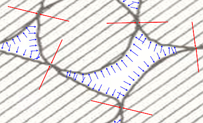 - door het deel van de waterspanning blauw weer te geven, resteert het deel korrelspanning, de in de figuren rood gestreepte zones (korrelspanning = totaal aan grondspanning -/- waterspanning)