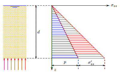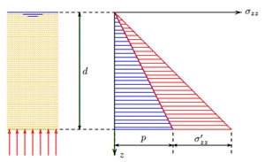 - Bij belasting van met water verzadigde grond zal een deel van het water uit de poriën geduwd worden, waarna een nieuw hydrostatisch evenwicht ontstaat. Bij compactere grond, zoals klei en veen, zal het langer duren voor het water is "weggeperst". Bij zand en grind kan het water vrij snel een weg vinden; denk aan je voetstappen op het strand als je langs de waterrand loopt, het zand rond je schoen iets omhoog komt en drooggezogen wordt doordat de korrels vrij snel uit hun dichte pakking worden gedrongen en er dus (meer) water tussen de korrels kan komen. (Hier zijn schuifspanningen aan het werk; zand is een zogenoemd dilatant materiaal: de belasting geeft volumevergroting en leidt tot vergroting van de poriën in het korrelskelet.)