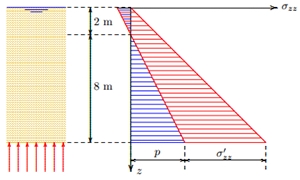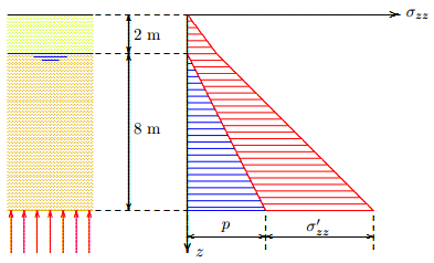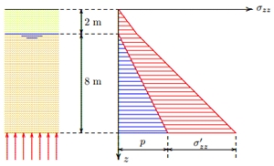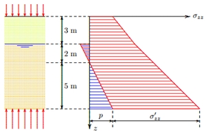 voorbeeld 4: met belasting op maaiveld, freatisch vlak 5 m onder maaiveld, capillaire opstijging van 2 m (boek grondmechanica arnold verruijt, 2001): ![]() |