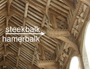 Verg. blokkeel (lijkt op de hamerbalk), sleutelstuk, korbeel, hanggewelf, "hangmakelaar".