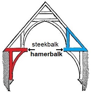 stijve driehoeken; door de hamerbalken, de schoren en de stijlen/gewelfgeboorten ontstaan (aan elke kant) twee driehoeken die voor een stijve constructie kunnen zorgen (de driehoek in de nok hoort er eigenlijk ook bij, als derde driehoek, maar is niet altijd prominent aanwezig): ![]() |