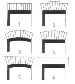 1 = rollaag 2 = hanenkam 3 = toog 4 = hanenkam, strekse boog, gestrekte toog 5 = getoogde strek 6 = latei. |