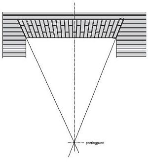 ontlastingsboog (strek, hanenkam) en porringpunt om de hoek van de bakstenen te bepalen; klik voor uitleg (uit "betrouwbaar baksteen" van ir. j.a. kooren): ![]() |