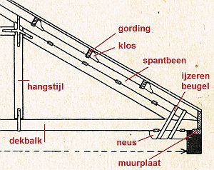 o.d.) is opgehangen, veelal door ijzeren beugels.Voorbeelden van een hangstijl, zie de