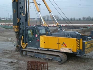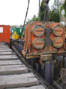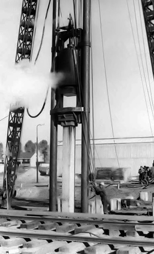 stoomheiblok; heiblok om een forse betonnen heipaal de grond in te heien (de werking van de stoommachine): ![]() |