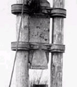 ouderwets valblok tussen de houten palen van de heistelling waarmee de natuurlijke val van het heiblok voor het heien zorgde; "bij een valblok werd het heiblok tussen twee palen opgehesen door een hendel over te halen waardoor de kabel op de lier werd gewonden; nadat het blok tot 2 à 3 m boven de heipaal is opgetrokken, wordt door het omzetten van een hendel, de trommel waarop de heireep is gewonden, vrijgemaakt van de as en valt het heiblok op de heipaal" (de werking van de stoommachine): ![]() |