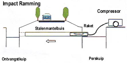 pneumatisch heiblok ("raket"), bijvoorbeeld voor het horizontaal heien van een stalen mantelbuis onder wegen; "de raket bestaat uit een stalen cilinder in de vorm van een torpedo waarin een pneumatisch beweegbare zuiger past; de zuiger slaat met kracht tegen een aambeeld voorin de cilinder; door de stootkracht van de zuiger tegen de cilinder, schiet de raket een stukje naar voren; tijdens de achterwaartse beweging van de zuiger blijft de raket op zijn plaats door de wrijving tussen de grond en de cilinder"; klik voor groter ![]() |