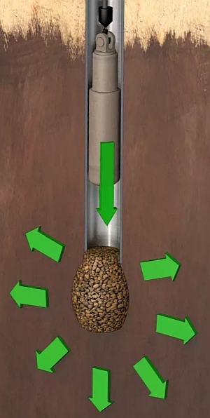inwendig valblok, grind onderin de paalvoet, o.m. om geluid en trillingen te verminderen; hier een franki-paal (franki grondtechnieken): ![]() |