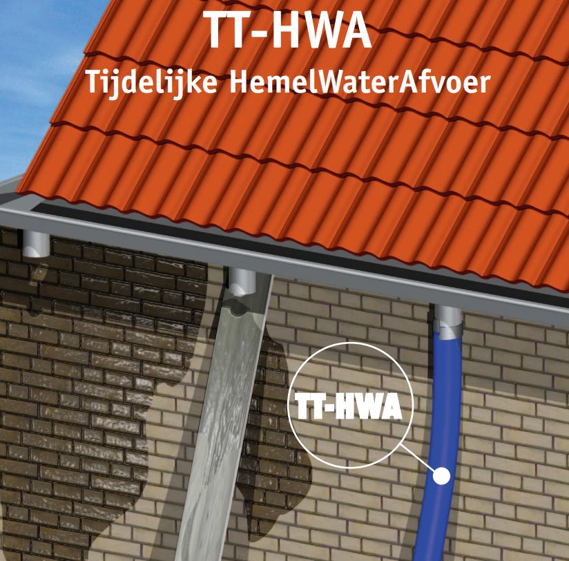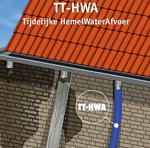Een goede gewoonte is om tijdens bouw of verbouwing voor een tijdelijke hemelwaterafvoer te zorgen: een flexibele slang met de diameter van de uitloop erboven en uitkomend in een deel van de tuin of bouwplaats waar het water weg mag lopen. De slang is eenvoudig aan te brengen en voor de duidelijkheid is deze slang vaak blauw van kleur.
