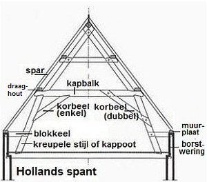 - twee korbeels (schoren, verbindingen kreupele stijlen met kapbalk; een dubbele korbeel bestaat uit twee planken die kapbalk en kreupele stijl aan weerszijden verbindt)
