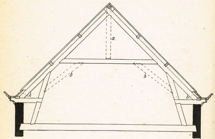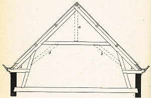 hollands spant, met tophoek van 90 graden; de constructie is al iets verbeterd (gordingen beter bevestigd aan spantbeen), maar kreupele stijl en dekbalk nog zonder korbeels (b),en nog zonder makelaar (a); klik voor groter (boek houtconstructies zwiers, 1920): ![]() |