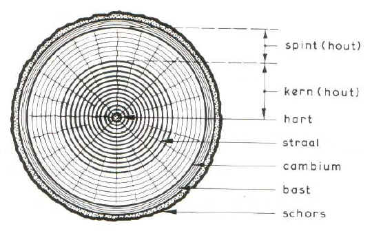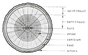 | klik op de afbeeldingen voor groter! doorsnede, met spint (spinthout), kern (kernhout), hart, straal, cambium, bast en schors: ![]() |