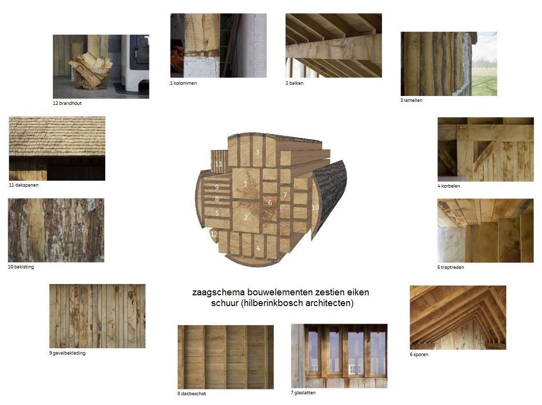 voor de zestien eiken schuur in berlicum zijn lokaal eiken gekapt en is bepaald welk deel van de boomstam voor welk deel van de schuur het beste gebruikt kon worden (kolommen, balken, lamellen, korbelen, traptreden, sporen, glaslatten, dakbeschot, gevelbekleding, bekisting, dakspanen, brandhout); klik op de afbeelding voor groter! (hilberinkbosch architecten): ![]() |